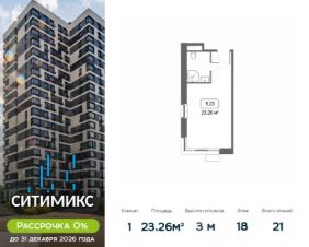 Продаётся студия в корпусе 5, общей площадью 23.26 м², на 18 этаже. Строительство корпуса завершено. Срок ввода — июль 2026 года.
