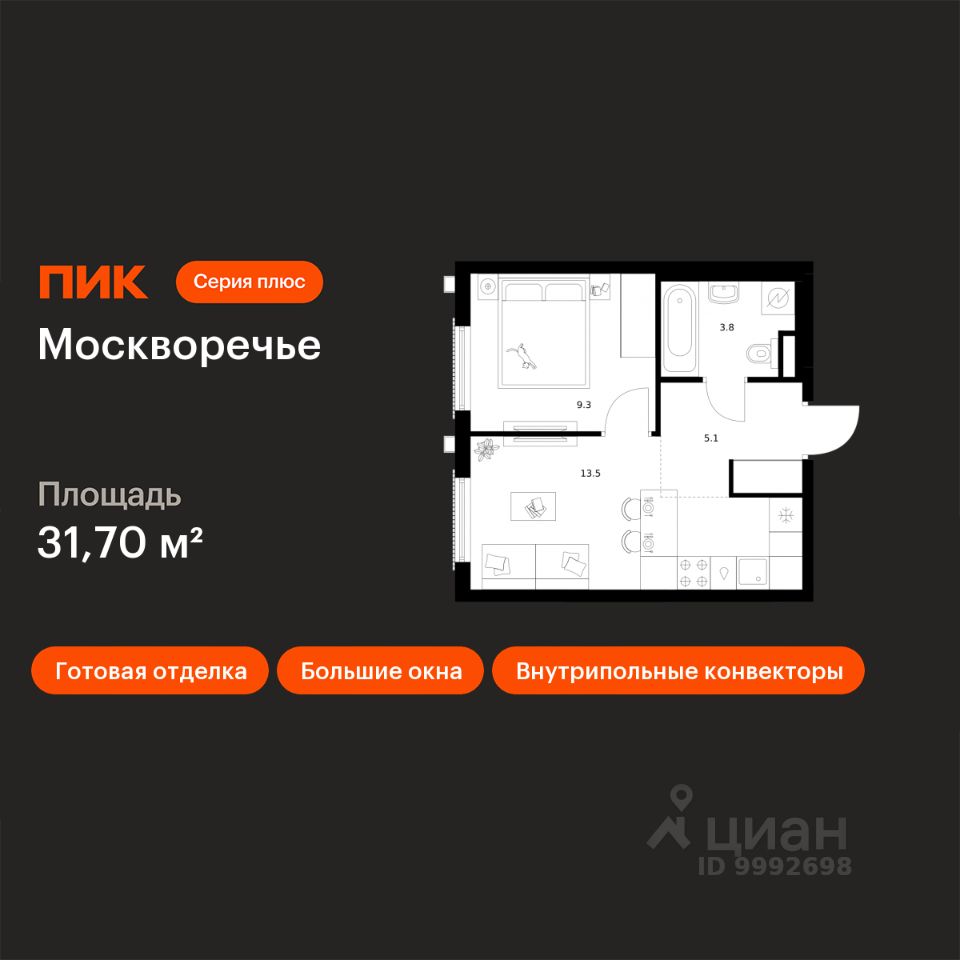 Продаётся 1-комн. квартира площадью 31,7 кв.м на 4 этаже 12 этажного дома (Корпус 1.4, Секция 6) проекта ПИК Москворечье. Светлый просторный подъезд на уровне земли, функциональная планировка, большие окна, c отделкой.