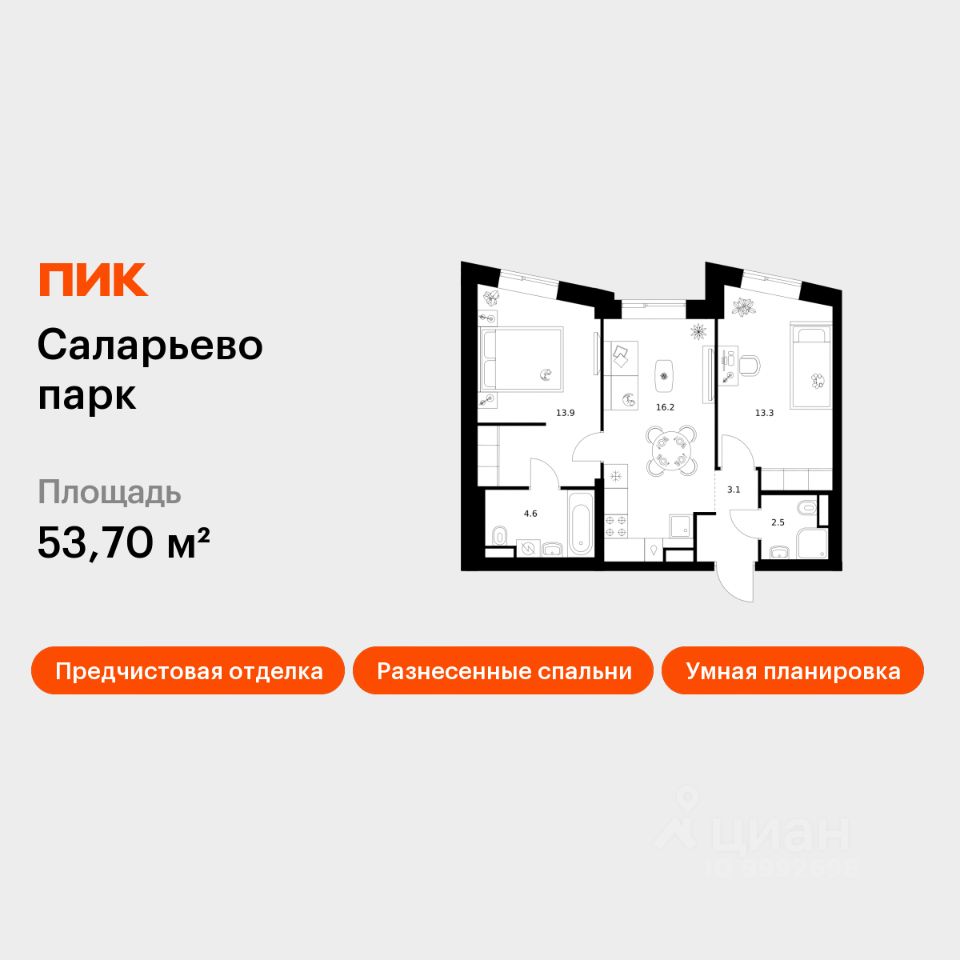 Продаётся 2-комн. квартира площадью 53,7 кв.м на 17 этаже 18 этажного дома (Корпус 74.2, Секция 2) проекта ПИК Саларьево парк. Светлый просторный подъезд на уровне земли, функциональная планировка, большие окна, предчистовая отделка.