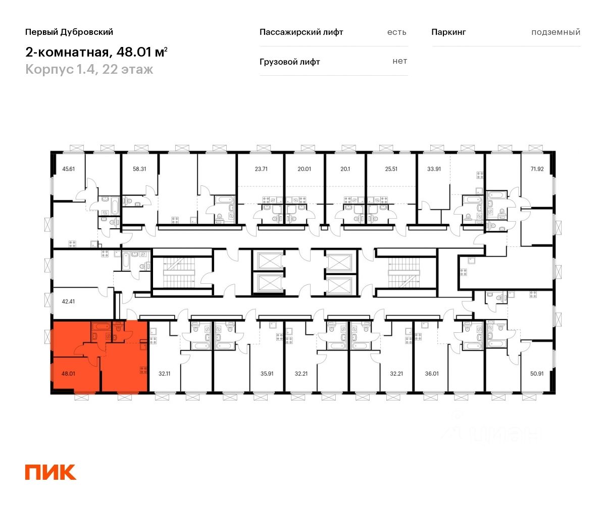 Продаётся 2-комн. квартира площадью 48,01 кв.м на 22 этаже 38 этажного дома (Корпус 1.4, Секция 2) проекта ПИК Первый Дубровский. Светлый просторный подъезд на уровне земли, функциональная планировка, большие окна, c отделкой.
