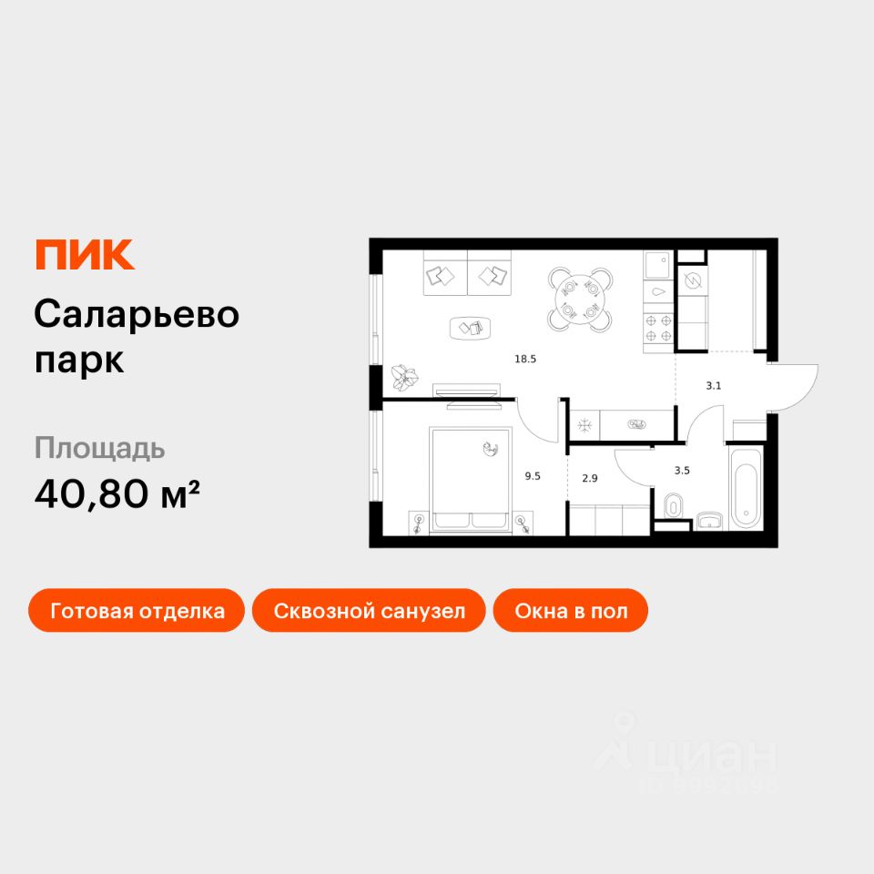 Продаётся 1-комн. квартира площадью 40,8 кв.м на 18 этаже 18 этажного дома (Корпус 74.9, Секция 9) проекта ПИК Саларьево парк. Светлый просторный подъезд на уровне земли, функциональная планировка, большие окна, c отделкой.