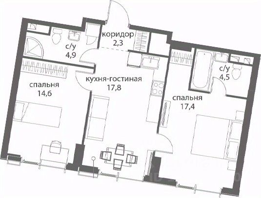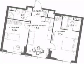 Квартира имеет функциональную планировку, которая включает в себя просторную гостиную, объединенную с кухней, две уютные спальни. Большие окна обеспечивают отличное естественное освещение и создают атмосферу простора.