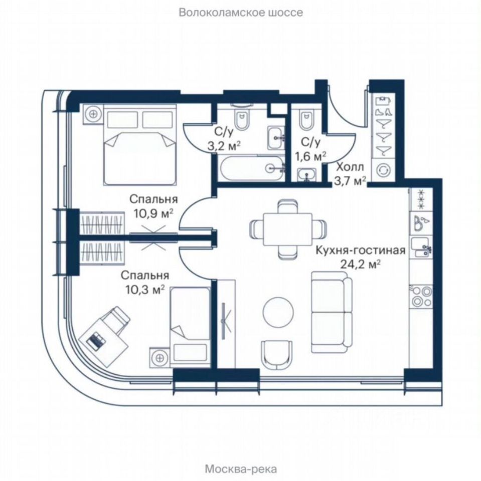 Общая площадь 54.9 м2 . Кухня гостиная 25 м2. Две комнаты по 11м2. Два сан узла. В квартире возведены внутри квартирные перегородки; осуществлено шпатлевание поверхности стен, стяжка пола; проложены трубы горячего, холодного водоснабжения и трубы канализации; разведена электрика до мест установки выключателей и розеток.