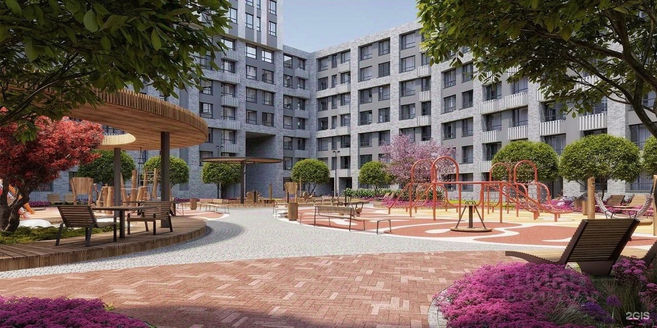 Закрытый двор, ландшафтное озеленение, зоны отдыха и детские площадки.