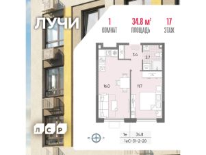 Продается 1-комнатная квартира общей площадью 34.8 кв. метров на 17 этаже жилого комплекса Лучи.
