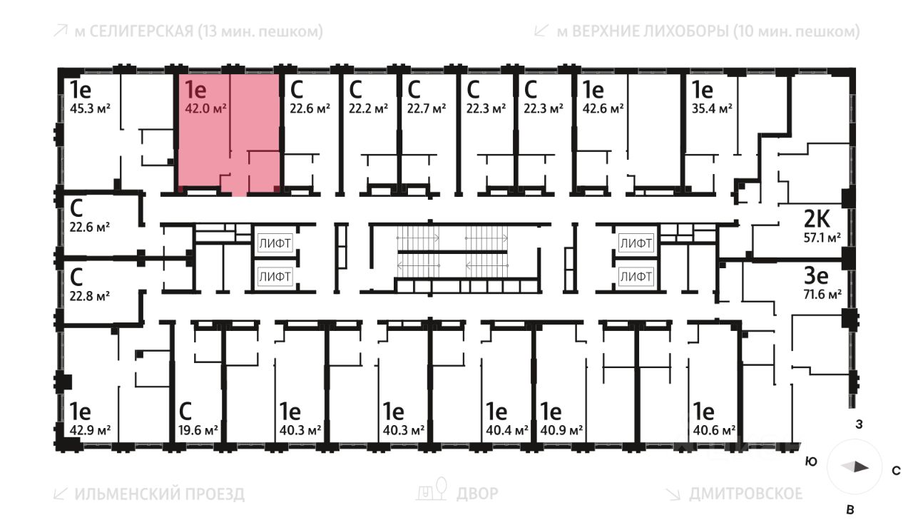 Продается 1-комнатная квартира общей площадью 42 кв. метров на 7 этаже жилого комплекса Дмитровское небо. Комплекс возводится в Северном административном округе в районе Западное Дегунино в Ильменском проезде, в 5 минутах ходьбы от метро "Верхние Лихоборы", а автомобилисты могут за пару минут выехать на Ильменский проезд и по нему добраться до Дмитровского шоссе.