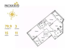 Продается 3-комнатная квартира в ЖК Рассказово на 18 этаже. Общая площадь квартиры составляет 79,9 кв.м. Квартира без отделки.