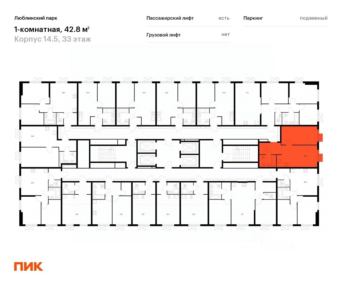 Продаётся 1-комн. квартира площадью 42,8 кв.м на 33 этаже 33 этажного дома (Корпус 14.5, Секция 3) проекта ПИК Люблинский парк. Светлый просторный подъезд на уровне земли, функциональная планировка, большие окна, c отделкой.