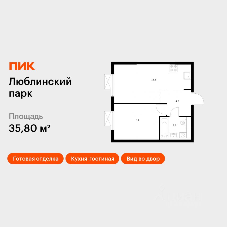 Продаётся 1-комн. квартира площадью 35,8 кв.м на 23 этаже 25 этажного дома (Корпус 12, Секция 1) проекта ПИК Люблинский парк. Светлый просторный подъезд на уровне земли, функциональная планировка, большие окна, c отделкой.