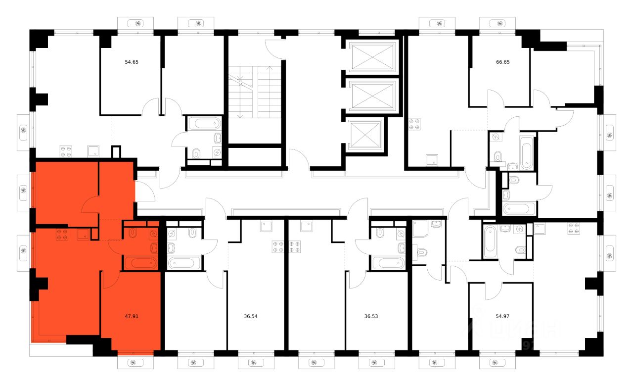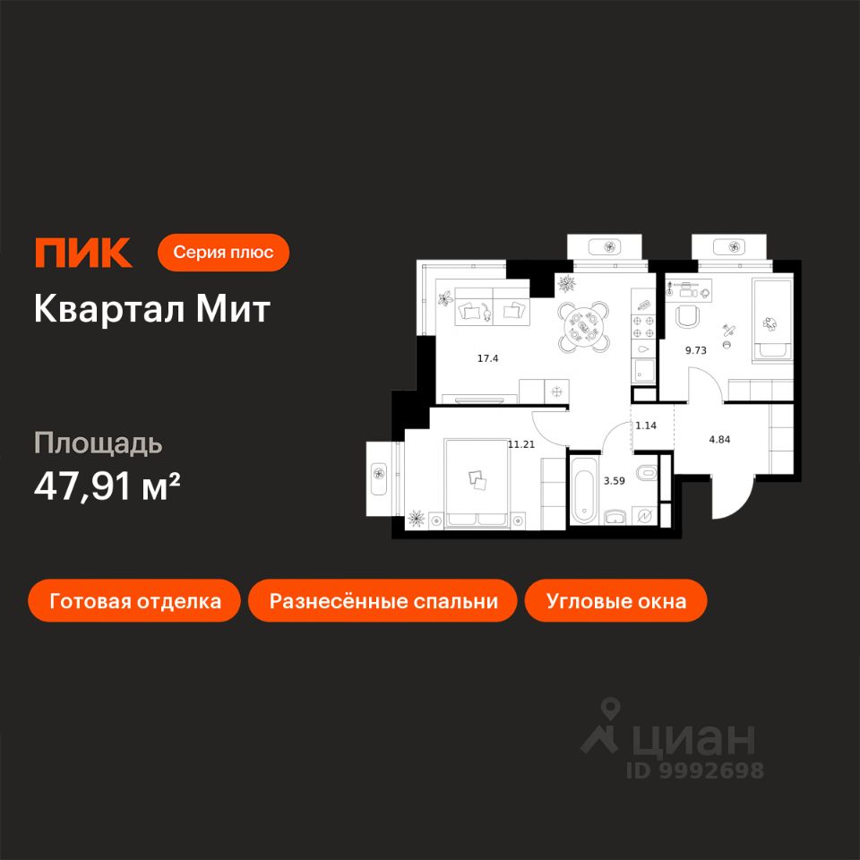 Продаётся 2-комн. квартира площадью 47,91 кв.м на 23 этаже 26 этажного дома (Корпус 3.2, Секция 2) проекта ПИК Квартал Мит. Светлый просторный подъезд на уровне земли, функциональная планировка, большие окна, c отделкой.
