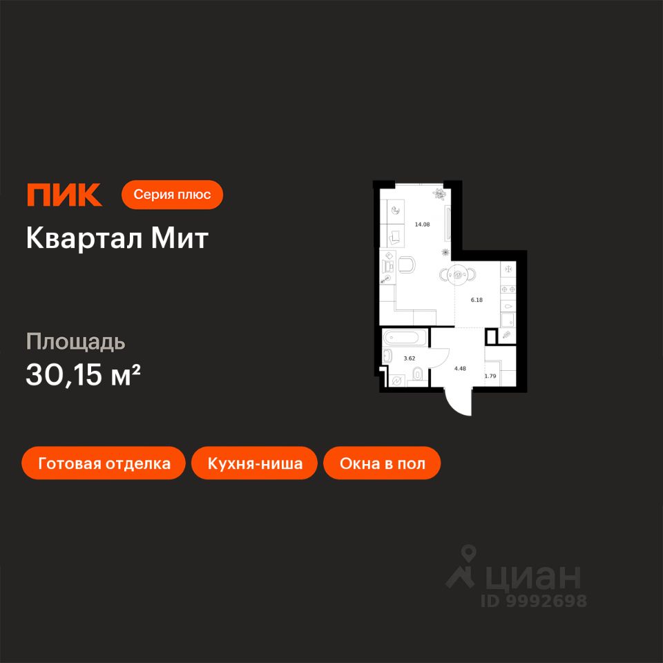 Новостройка! Продается 1-комн. кв-ра площадью 30,15 кв.м, (Корпус 3.4, Секция 4) 6 этаж 32-этажного дома в Квартал Мит от ПИК. "Квартал Мит" строится в экологически чистом районе Митино, где по соседству расположен большой лесопарк, а с двух сторон протекают реки Сходня и Журавка. Для семей с детьми здесь появится школа и два детских сада.