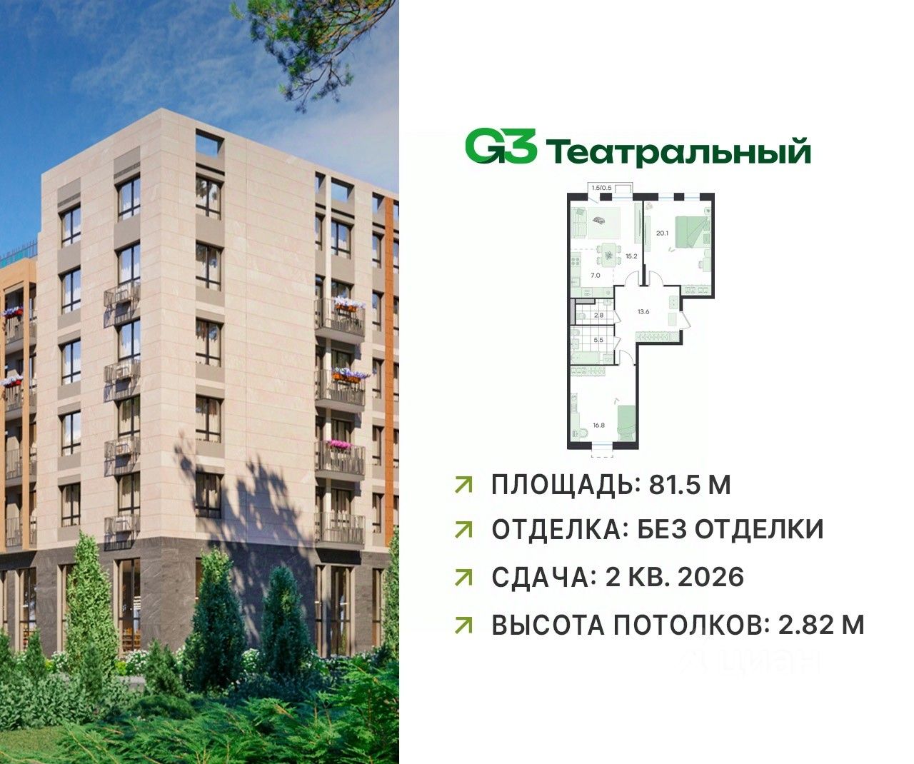 В современном квартале бизнес-класса G3 Театральный продаётся 3-комнатная квартира, общей площадью 81.5 кв.м, расположенная на 4 этаже (корпус 2, секция 5).