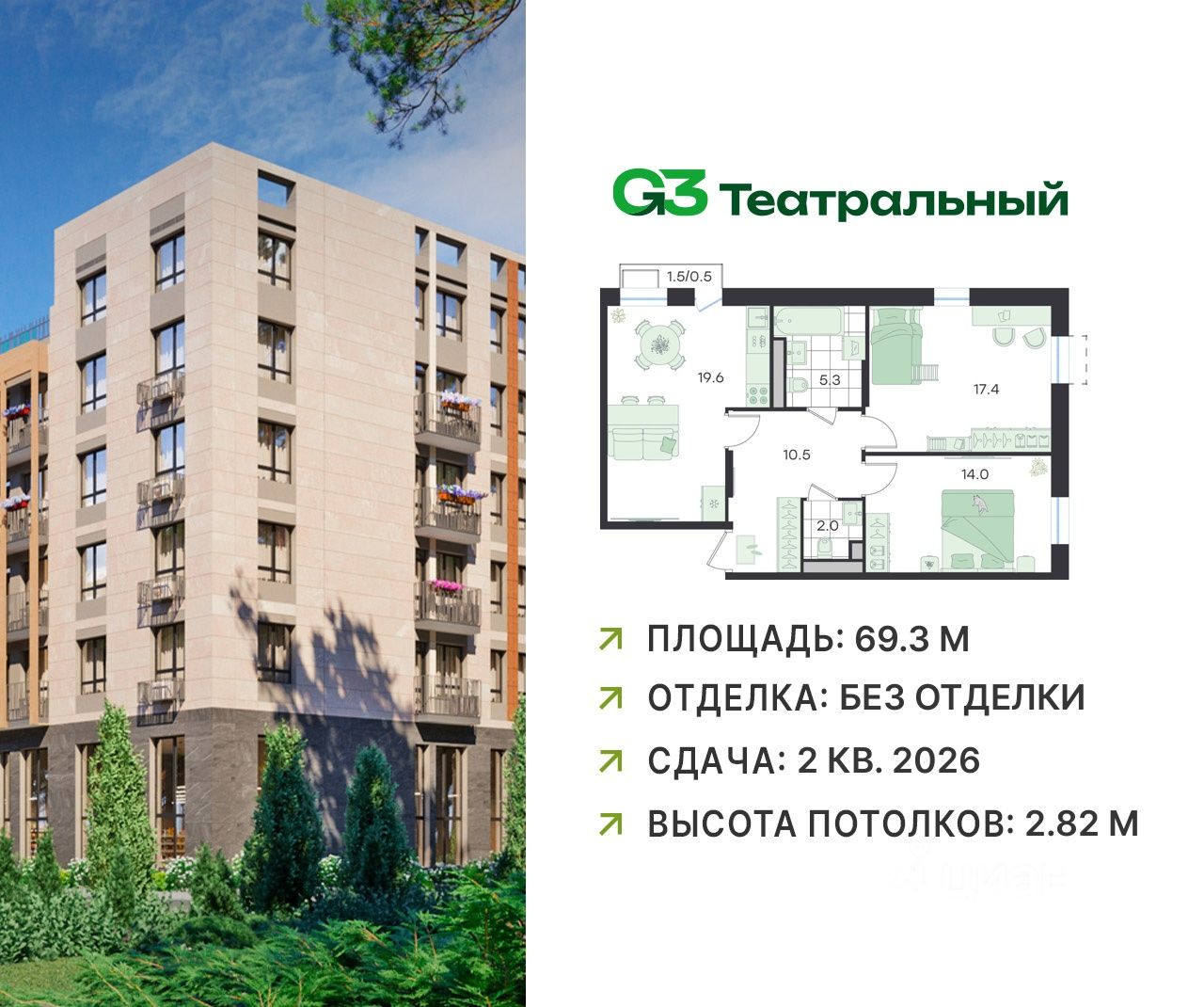 В современном квартале бизнес-класса G3 Театральный продаётся 2-комнатная квартира, общей площадью 69.3 кв.м, расположенная на 4 этаже (корпус 2, секция 5).
