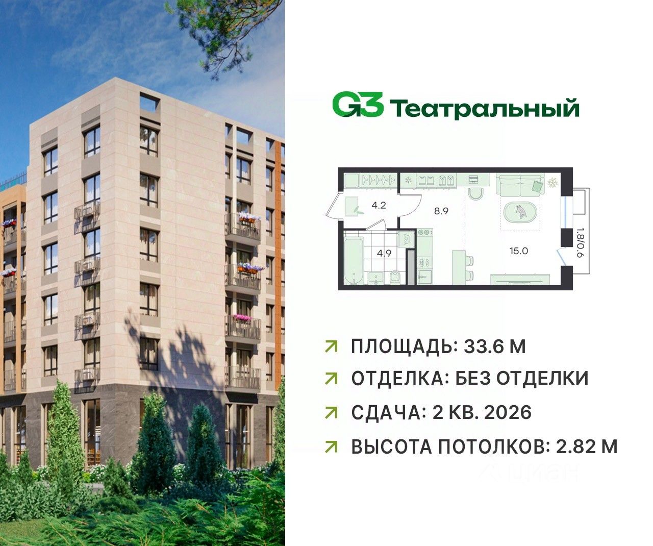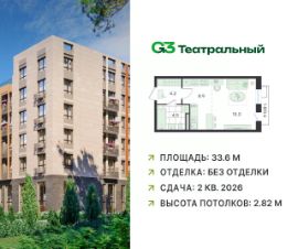 В современном квартале бизнес-класса G3 Театральный продаётся квартира-студия, общей площадью 33.6 кв.м, расположенная на 4 этаже (корпус 2, секция 5).