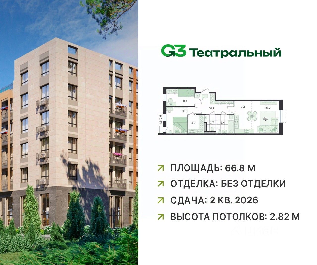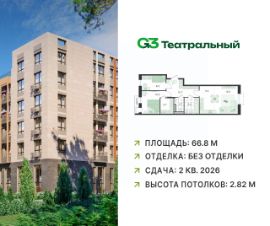 В современном квартале бизнес-класса G3 Театральный продаётся 3-комнатная квартира, общей площадью 66.8 кв.м, расположенная на 4 этаже (корпус 2, секция 5).