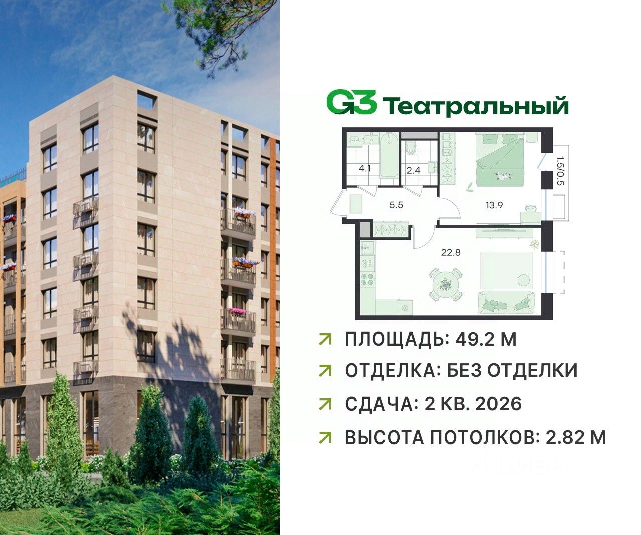 В современном квартале бизнес-класса G3 Театральный продаётся 2-комнатная квартира, общей площадью 49.2 кв.м, расположенная на 2 этаже (корпус 2, секция 6).