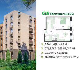 В современном квартале бизнес-класса G3 Театральный продаётся 1-комнатная квартира, общей площадью 49.3 кв.м, расположенная на 3 этаже (корпус 2, секция 6).