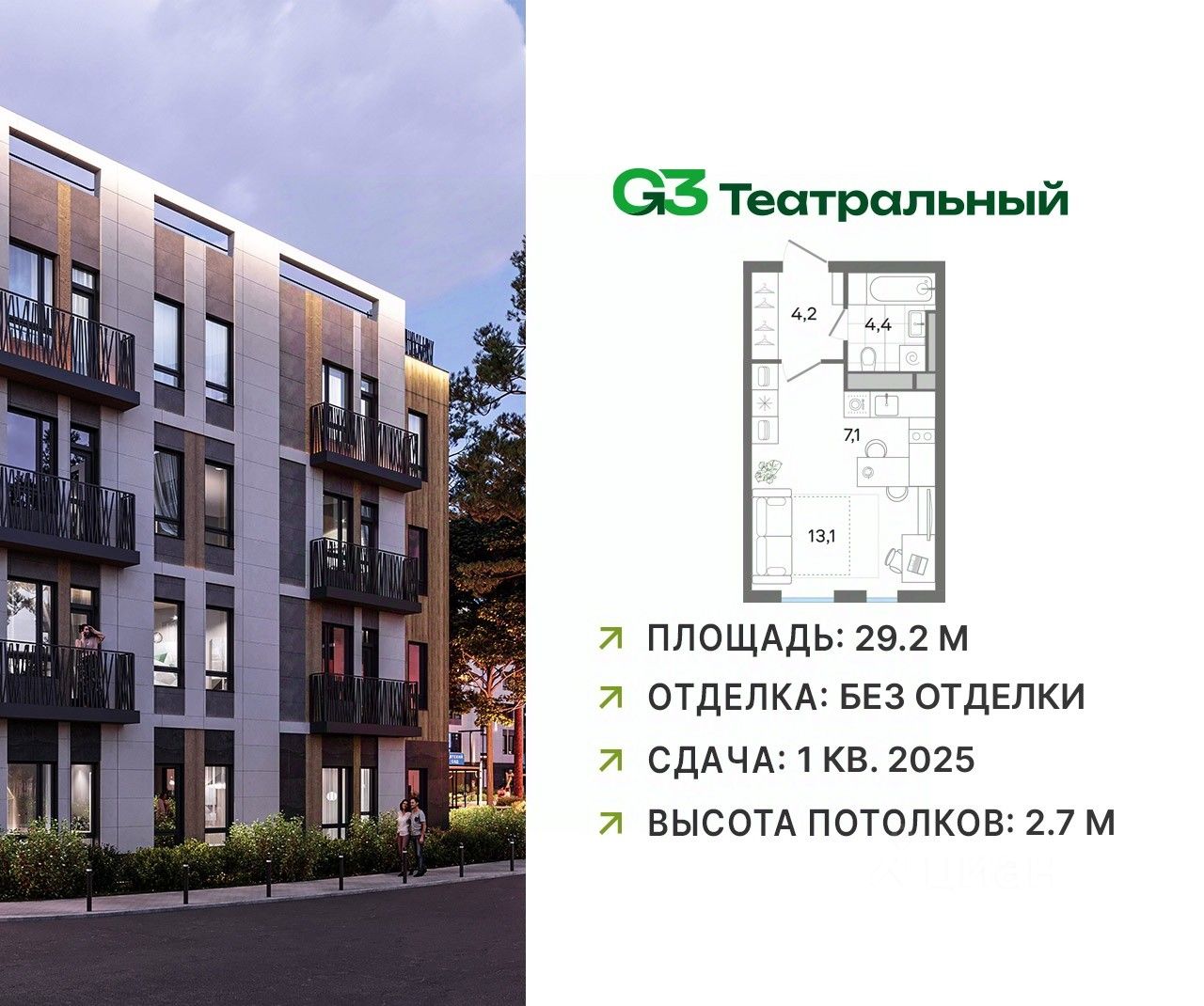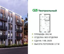 В современном квартале бизнес-класса G3 Театральный продаётся квартира-студия, общей площадью 29.2 кв.м, расположенная на 1 этаже (корпус 1, секция 1).