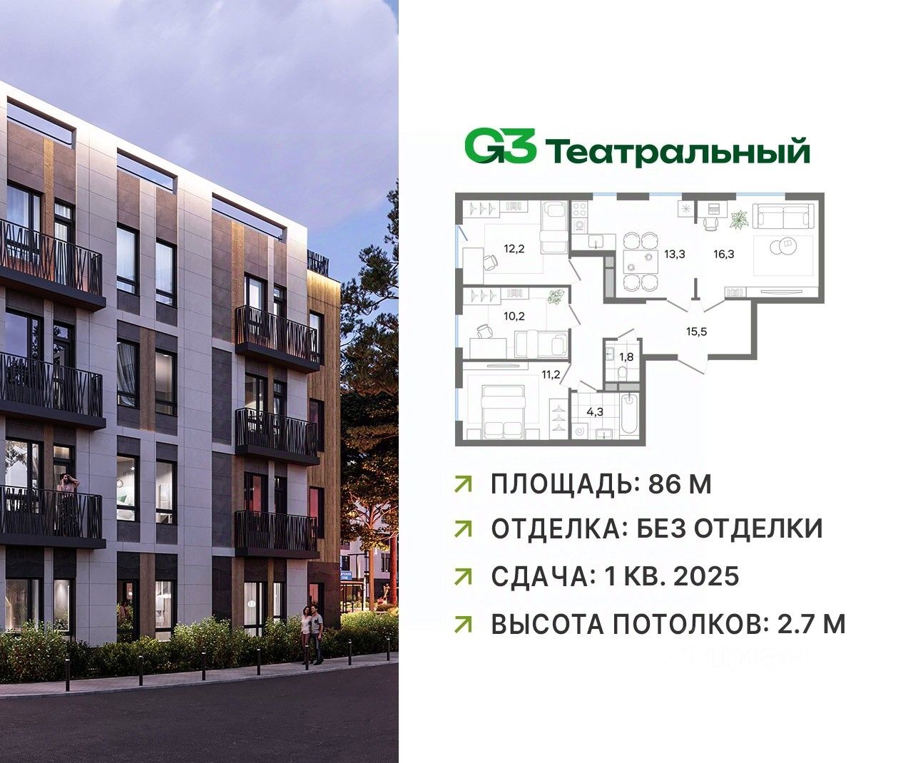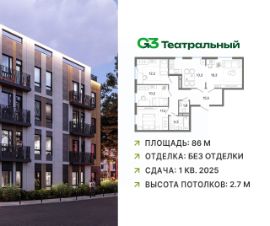 В современном квартале бизнес-класса G3 Театральный продаётся 4-комнатная квартира, общей площадью 86 кв.м, расположенная на 1 этаже (корпус 1, секция 10).