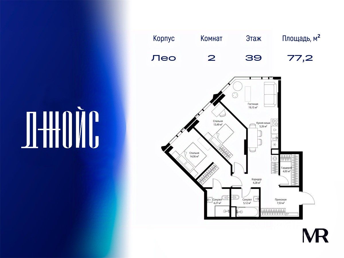 В продаже квартира площадью 77.16 м² без отделки на 39 этаже 46 этажного дома. Квартира расположена в корпусе Лео.