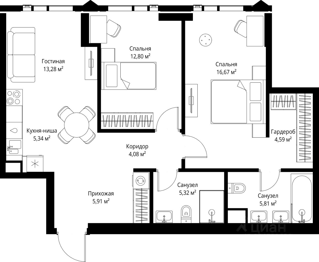 В продаже квартира площадью 73.80 м² без отделки на 33 этаже 46 этажного дома. Квартира расположена в корпусе Leo.
