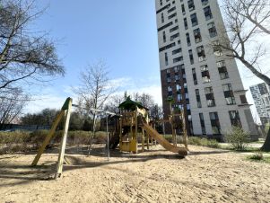 Во дворе есть прогулочные зоны, вымощенные плиткой, детские и спортивные площадки, красивые качели, футбольное поле, декоративные арки с подсветкой. Внутренние убранство двора - очень симпатичное, там приятно находится и проводить время.