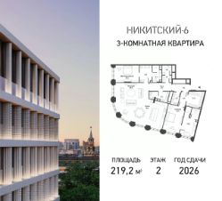Квартира с 2 мастер-спальнями общей площадью 219,2 м2 расположена на 2-м этаже жилого дома "Никитский 6". Из окон открываются великолепные виды на Воздвиженку, Арбат и Никитский бульвар. Планировочное решение включает панорамную кухню-гостиную, 2 мастер-спальни с личными гардеробными и ванными комнатами, а также функциональные сервисные пространства.