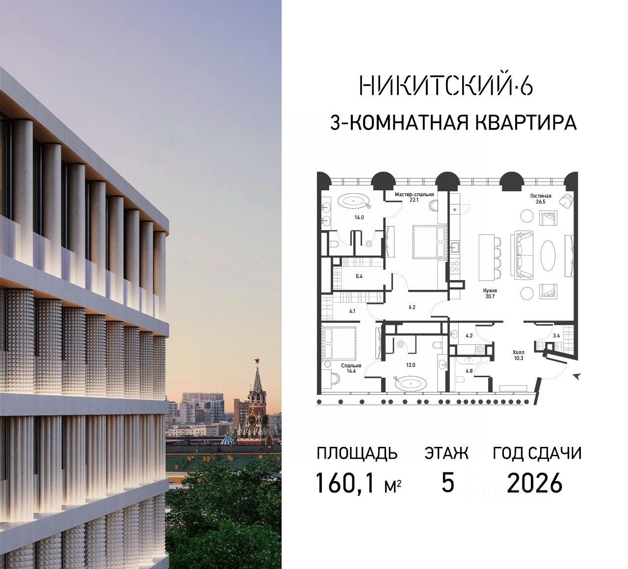 Квартира общей площадью 160,1 кв. м расположена на 5-м этаже жилого дома "Никитский 6". Из окон открывается вид на Никитский бульвар и Центральный Дом журналиста. Планировочное решение включает панорамную гостиную, 2 мастер-спальни с личными ванными и гардеробными комнатами и сервисные помещения.