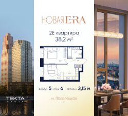 2-комн. квартира в ЖК "Era" на 6 этаже в 52 этажном здании Корпус 5. Общая площадь: 38.2 кв.м., жилая: 26.30 кв.м. Высота потолков 3.15 м.