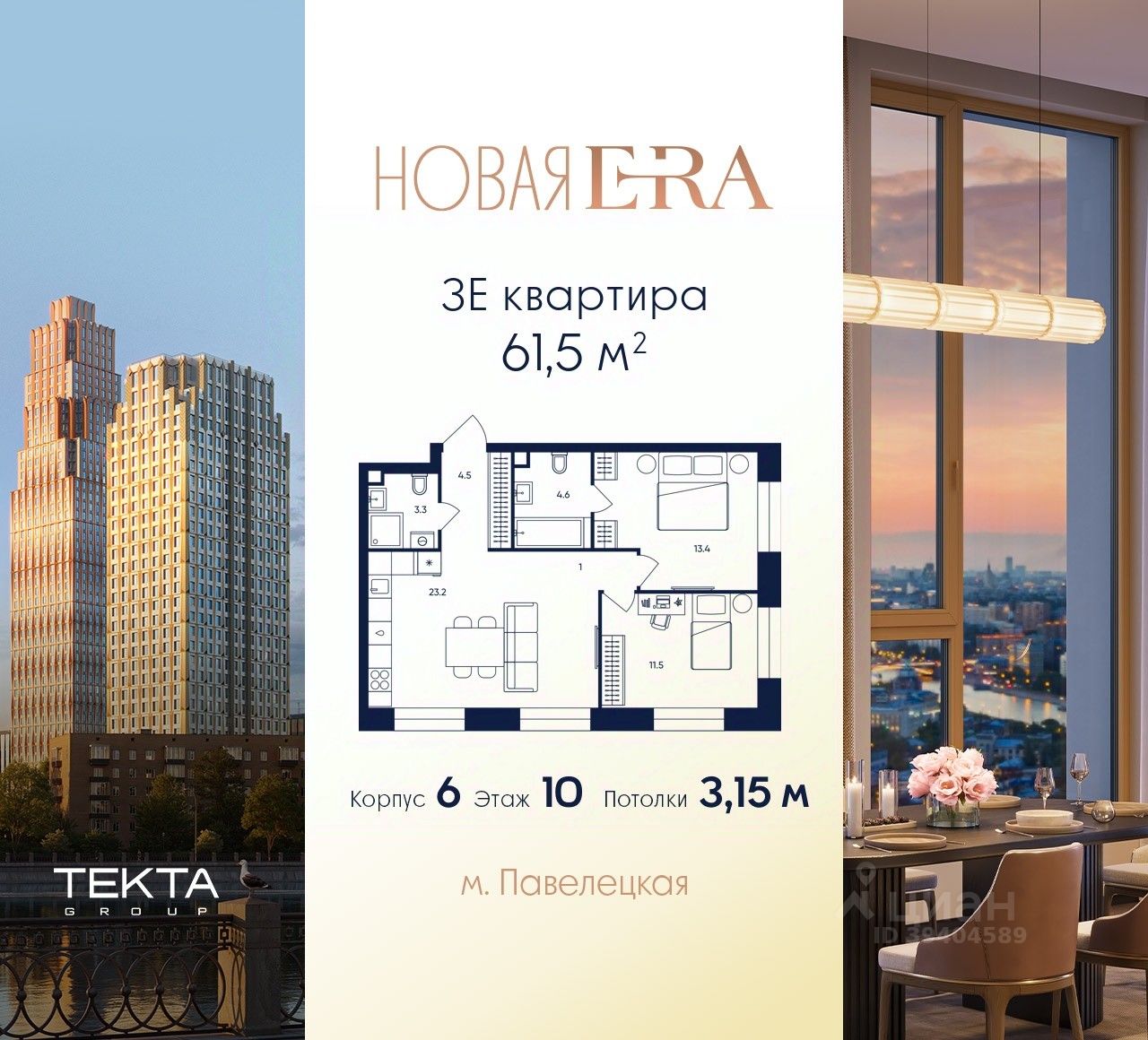 3-комн. квартира в ЖК "Era" на 10 этаже в 37 этажном здании Корпус 6. Общая площадь: 61.5 кв.м., жилая: 40.80 кв.м. Высота потолков 3.15 м.