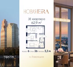 3-комн. квартира в ЖК "Era" на 26 этаже в 37 этажном здании Корпус 6. Общая площадь: 62.9 кв.м., жилая: 38.90 кв.м. Высота потолков 3.30 м.
