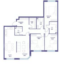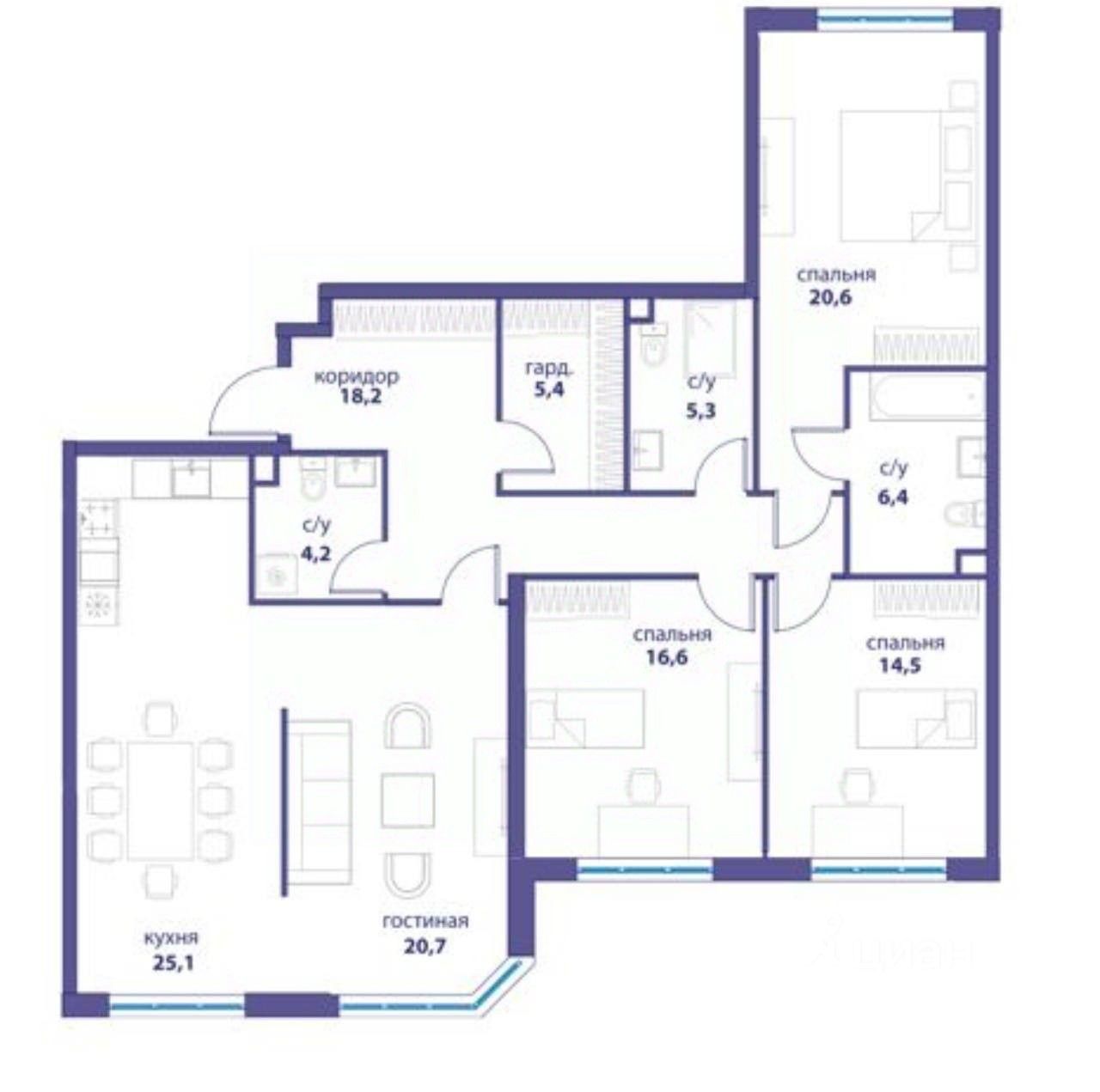 Планировка представляет из себя кухню гостиную(45.8м2) и 3 изолированные комнаты (16.6, 14.5, 20.6). Комната 20.6м2 является мастер блоком со своим сан узлом.