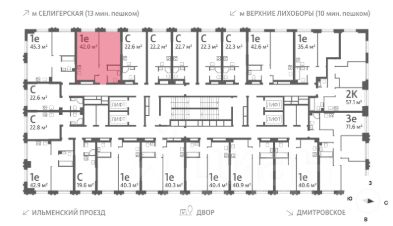 Продается 1-комнатная квартира общей площадью 42 кв. метров на 4 этаже жилого комплекса Дмитровское небо. Комплекс возводится в Северном административном округе в районе Западное Дегунино в Ильменском проезде, в 5 минутах ходьбы от метро "Верхние Лихоборы", а автомобилисты могут за пару минут выехать на Ильменский проезд и по нему добраться до Дмитровского шоссе.