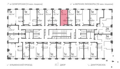 Продается квартира-студия общей площадью 22.3 кв. метров на 4 этаже жилого комплекса Дмитровское небо. Комплекс возводится в Северном административном округе в районе Западное Дегунино в Ильменском проезде, в 5 минутах ходьбы от метро "Верхние Лихоборы", а автомобилисты могут за пару минут выехать на Ильменский проезд и по нему добраться до Дмитровского шоссе.