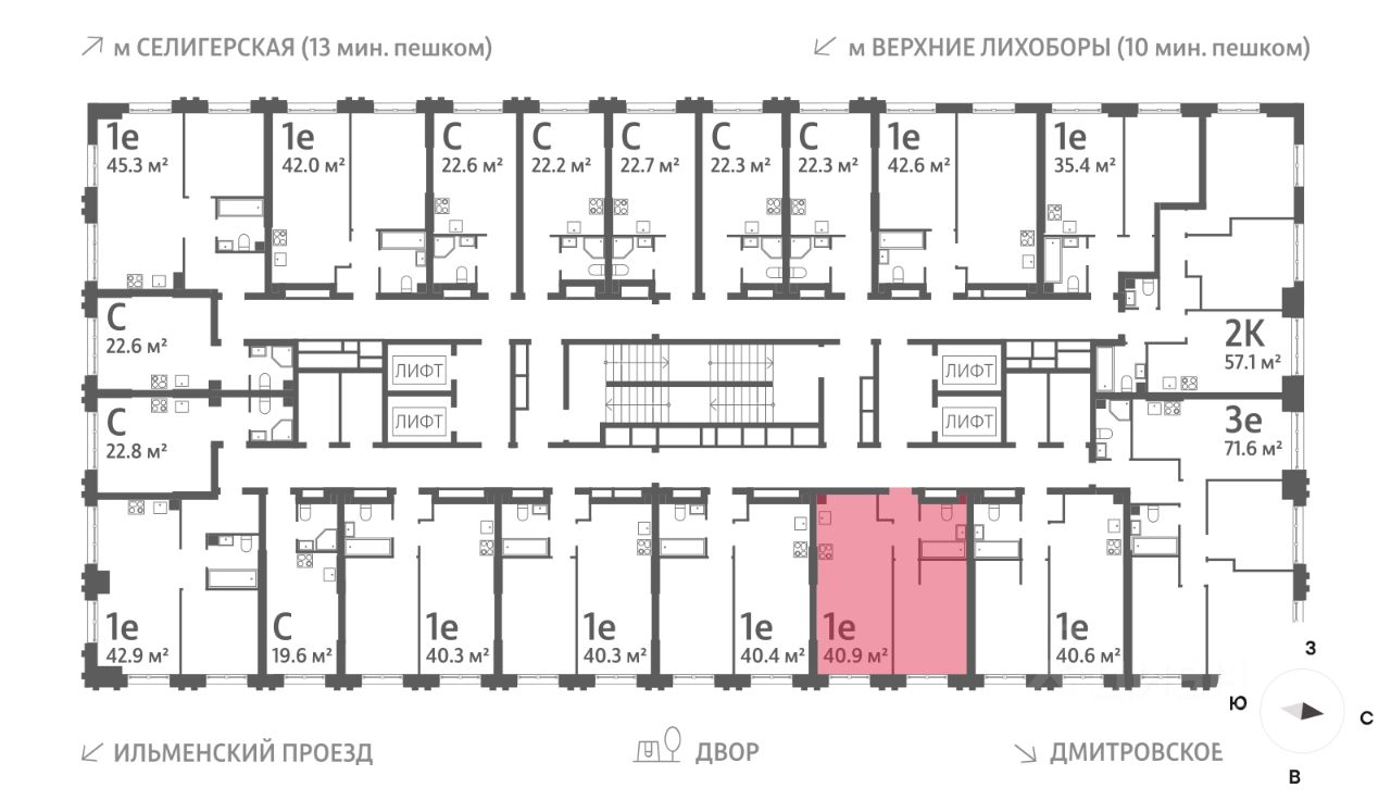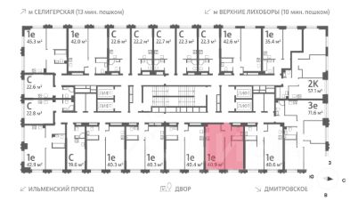 Продается 1-комнатная квартира общей площадью 40.9 кв. метров на 7 этаже жилого комплекса Дмитровское небо. Комплекс возводится в Северном административном округе в районе Западное Дегунино в Ильменском проезде, в 5 минутах ходьбы от метро "Верхние Лихоборы", а автомобилисты могут за пару минут выехать на Ильменский проезд и по нему добраться до Дмитровского шоссе.