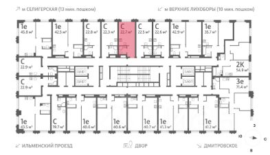 Продается квартира-студия общей площадью 22.7 кв. метров на 10 этаже жилого комплекса Дмитровское небо. Комплекс возводится в Северном административном округе в районе Западное Дегунино в Ильменском проезде, в 5 минутах ходьбы от метро "Верхние Лихоборы", а автомобилисты могут за пару минут выехать на Ильменский проезд и по нему добраться до Дмитровского шоссе.