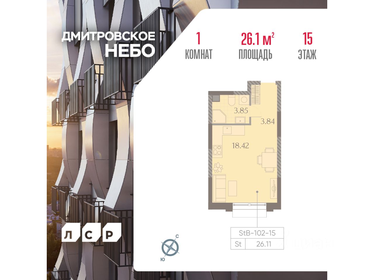 Продается квартира-студия общей площадью 26.11 кв. метров на 15 этаже жилого комплекса Дмитровское небо. Комплекс возводится в Северном административном округе в районе Западное Дегунино в Ильменском проезде, в 5 минутах ходьбы от метро "Верхние Лихоборы", а автомобилисты могут за пару минут выехать на Ильменский проезд и по нему добраться до Дмитровского шоссе.