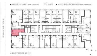 Продается квартира-студия общей площадью 21.5 кв. метров на 32 этаже жилого комплекса Дмитровское небо. Комплекс возводится в Северном административном округе в районе Западное Дегунино в Ильменском проезде, в 5 минутах ходьбы от метро "Верхние Лихоборы", а автомобилисты могут за пару минут выехать на Ильменский проезд и по нему добраться до Дмитровского шоссе.