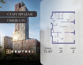 Продаётся 2-комнатная квартира от застройщика: общая площадь 71.40 м², жилая 31.00 м², кухня 23.80 м², 21-й этаж, жилой квартал "Событие-6", корпус 2 (секция 1) Срок сдачи: 1 квартал 2029 года.