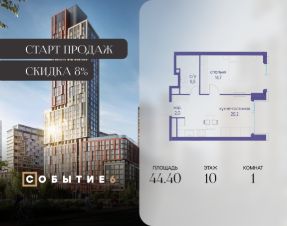 Продаётся 1-комнатная квартира от застройщика: общая площадь 44.40 м², жилая 16.70 м², кухня 20.20 м², 10-й этаж, жилой квартал "Событие-6", корпус 2 (секция 1) Срок сдачи: 1 квартал 2029 года.