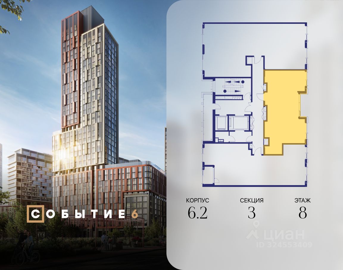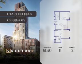 Продаётся 2-комнатная квартира от застройщика: общая площадь 61.40 м², жилая 31.60 м², кухня 16.90 м², 8-й этаж, жилой квартал "Событие-6", корпус 2 (секция 3) Срок сдачи: 1 квартал 2029 года.
