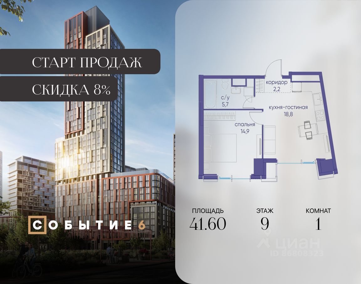 Продаётся 1-комнатная квартира от застройщика: общая площадь 41.60 м², жилая 14.90 м², кухня 18.80 м², 9-й этаж, жилой квартал "Событие-6", корпус 2 (секция 5) Срок сдачи: 1 квартал 2029 года.