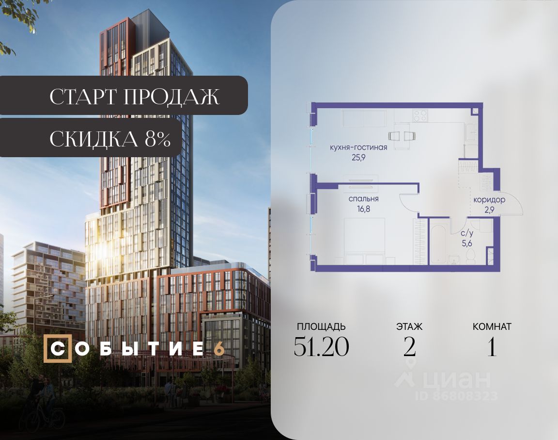 Продаётся 1-комнатная квартира от застройщика: общая площадь 51.20 м², жилая 16.80 м², кухня 25.90 м², 2-й этаж, жилой квартал "Событие-6", корпус 2 (секция 1) Срок сдачи: 1 квартал 2029 года.