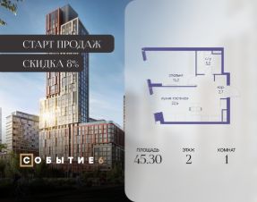 Продаётся 1-комнатная квартира от застройщика: общая площадь 45.30 м², жилая 15.20 м², кухня 22.40 м², 2-й этаж, жилой квартал "Событие-6", корпус 2 (секция 1) Срок сдачи: 1 квартал 2029 года.
