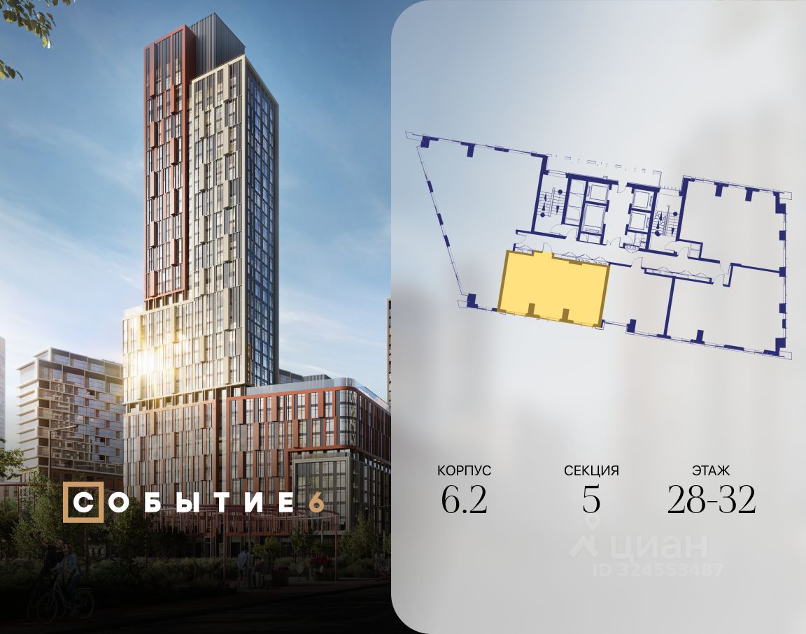 Продаётся 2-комнатная квартира от застройщика: общая площадь 61.80 м², жилая 32.90 м², кухня 17.80 м², 32-й этаж, жилой квартал "Событие-6", корпус 2 (секция 5) Срок сдачи: 1 квартал 2029 года.