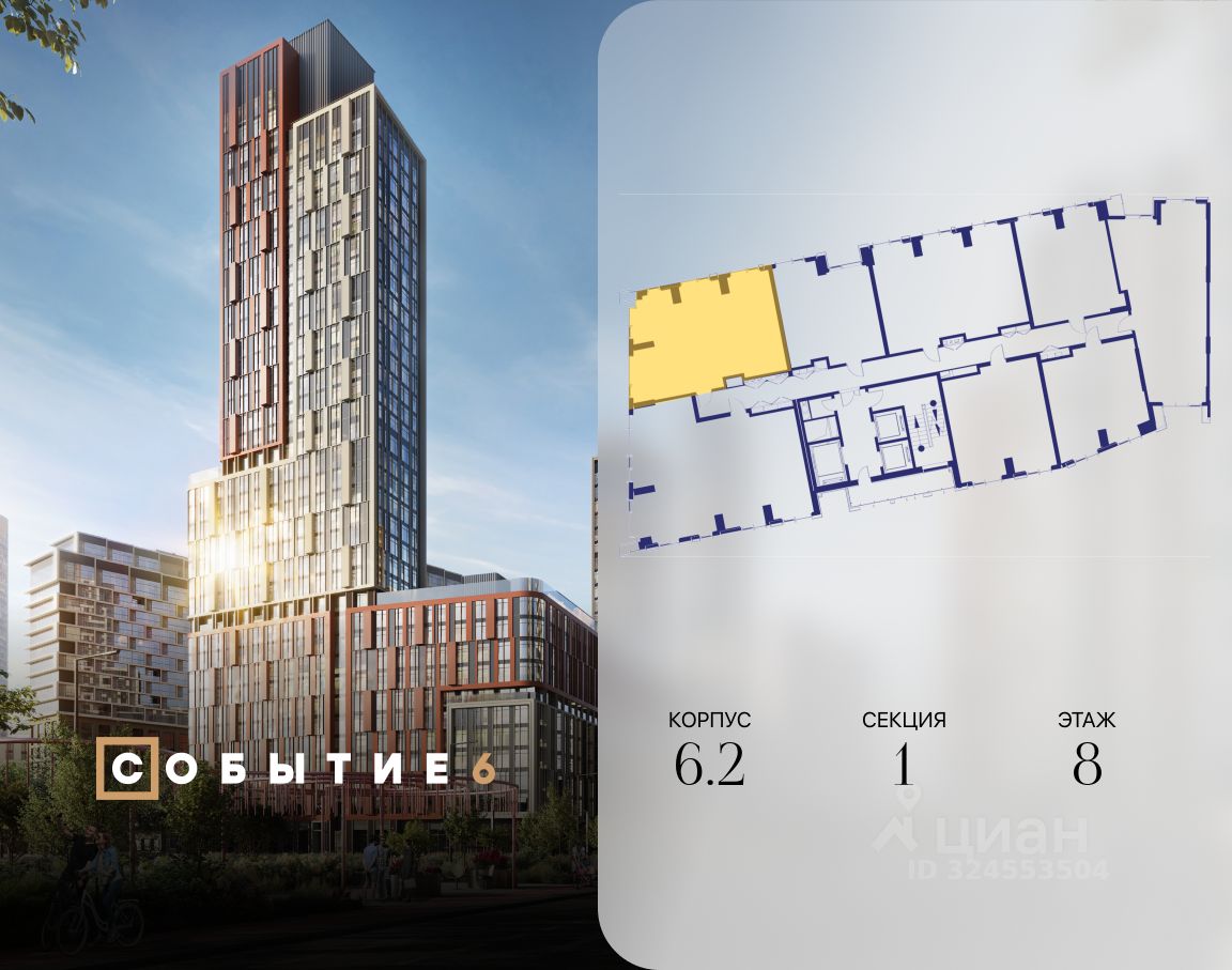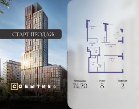 Продаётся 2-комнатная квартира от застройщика: общая площадь 74.20 м², жилая 28.60 м², кухня 26.40 м², 8-й этаж, жилой квартал "Событие-6", корпус 2 (секция 1) Срок сдачи: 1 квартал 2029 года.