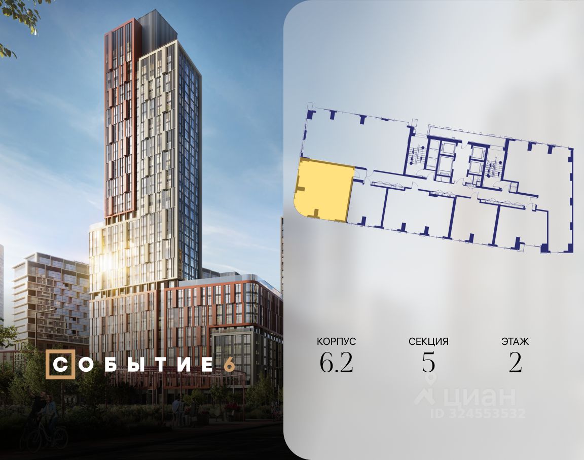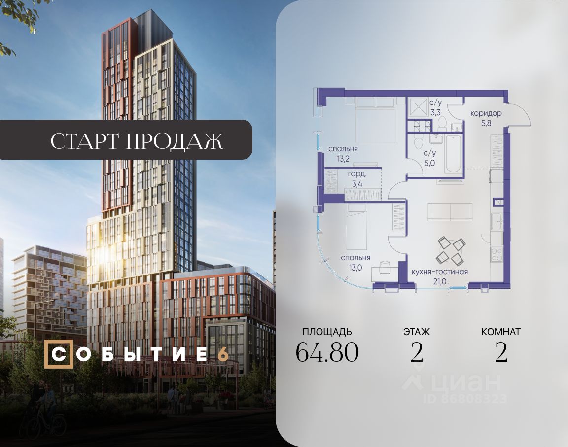 Продаётся 2-комнатная квартира от застройщика: общая площадь 64.80 м², жилая 26.20 м², кухня 21.00 м², 2-й этаж, жилой квартал "Событие-6", корпус 2 (секция 5) Срок сдачи: 1 квартал 2029 года.