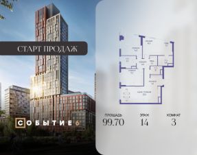 Продаётся 3-комнатная квартира от застройщика: общая площадь 99.70 м², жилая 42.00 м², кухня 23.20 м², 14-й этаж, жилой квартал "Событие-6", корпус 2 (секция 1) Срок сдачи: 1 квартал 2029 года.