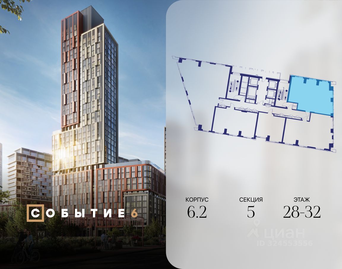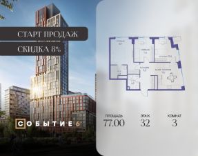 Продаётся 3-комнатная квартира от застройщика: общая площадь 77.00 м², жилая 41.90 м², кухня 17.60 м², 32-й этаж, жилой квартал "Событие-6", корпус 2 (секция 5) Срок сдачи: 1 квартал 2029 года.