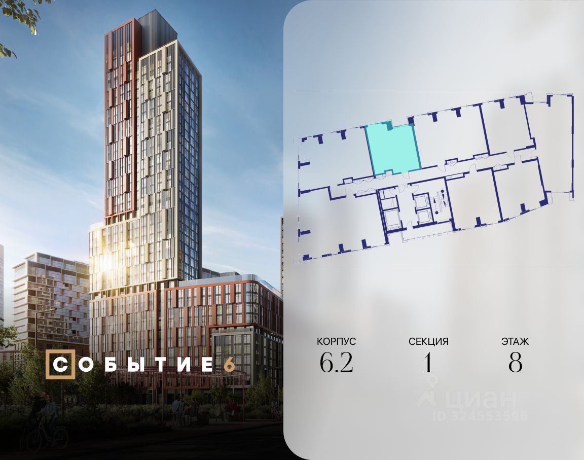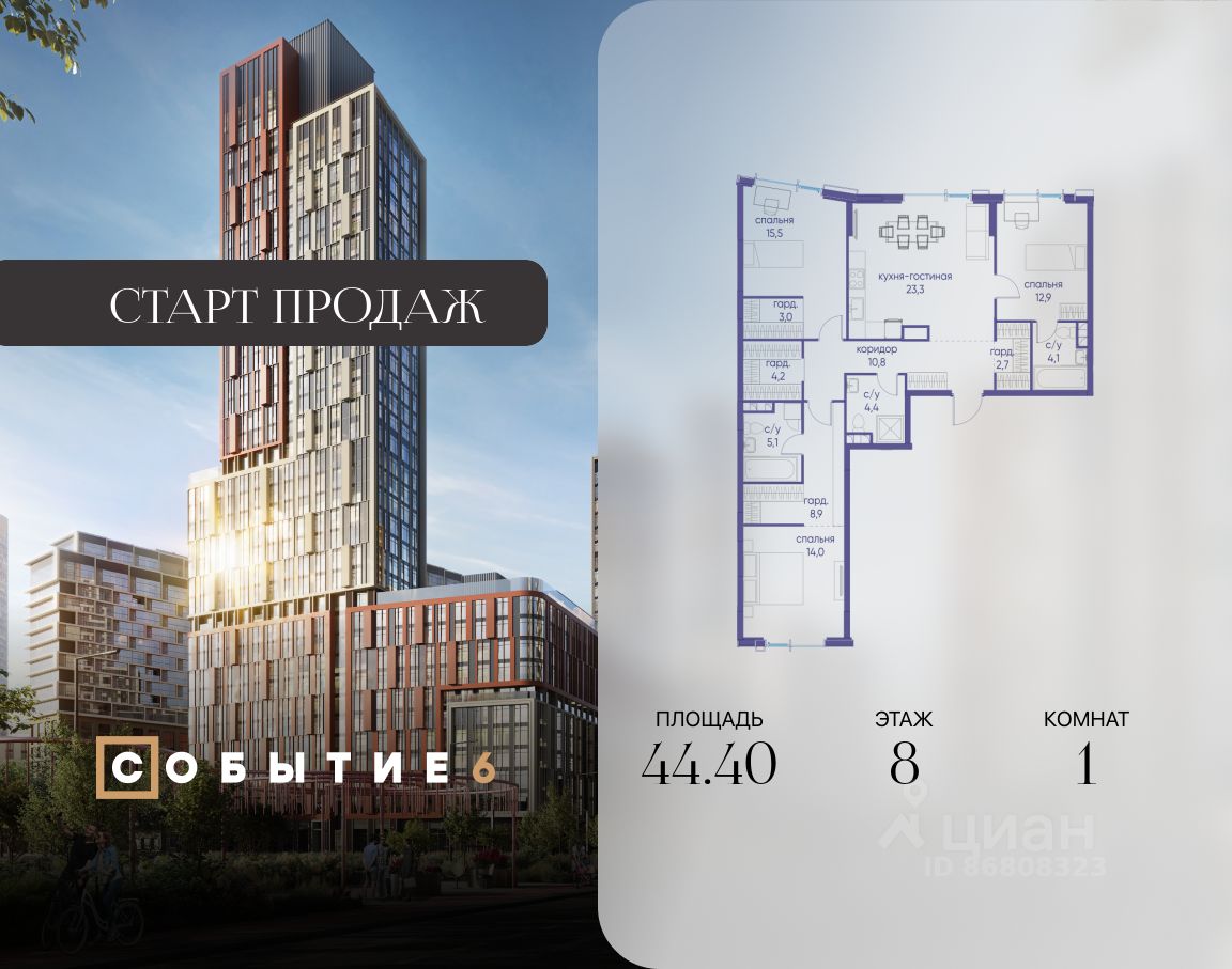 Продаётся 1-комнатная квартира от застройщика: общая площадь 44.40 м², жилая 16.70 м², кухня 20.20 м², 8-й этаж, жилой квартал "Событие-6", корпус 2 (секция 1) Срок сдачи: 1 квартал 2029 года.